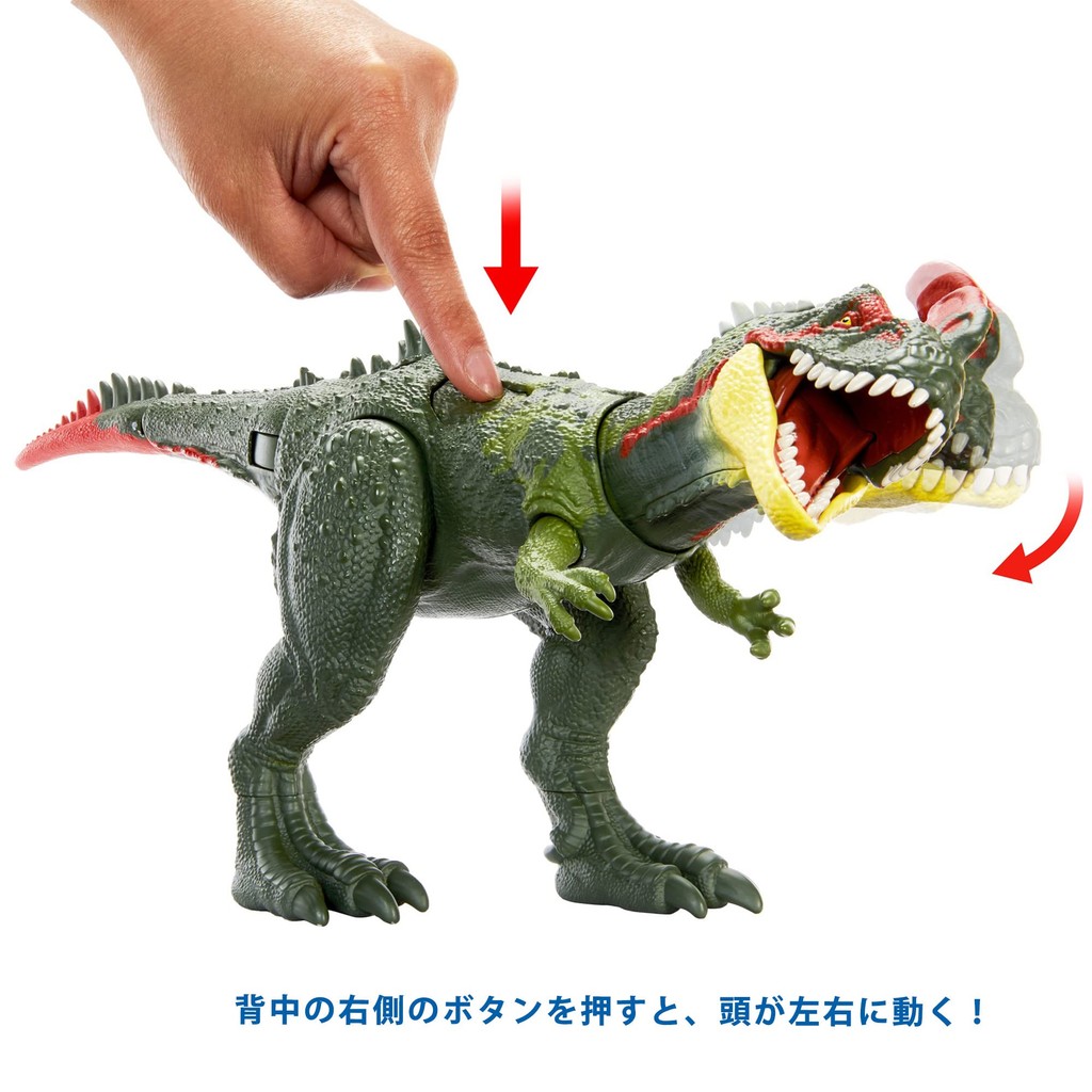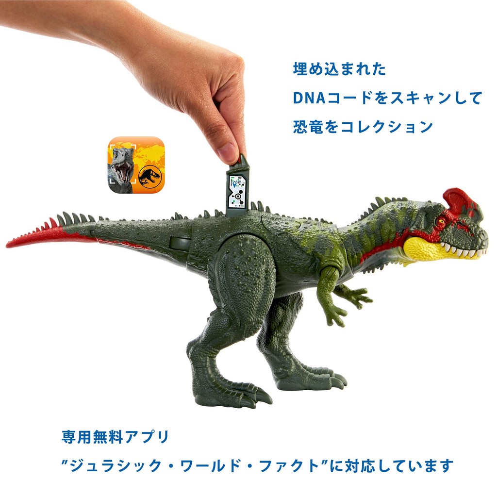 [Contents] A Sinotyrannus figure that allows you to enjoy various battle actions using the two buttons on its back. Pressing the button on the right side of the back will move the head left and right, and pressing the button on the left side will move the tail left and right. It is compatible with the free app "Jurassic World Facts" that works with the figures, and you can collect dinosaurs by scanning the DNA code with your smartphone.
