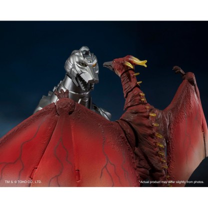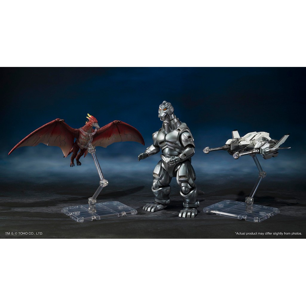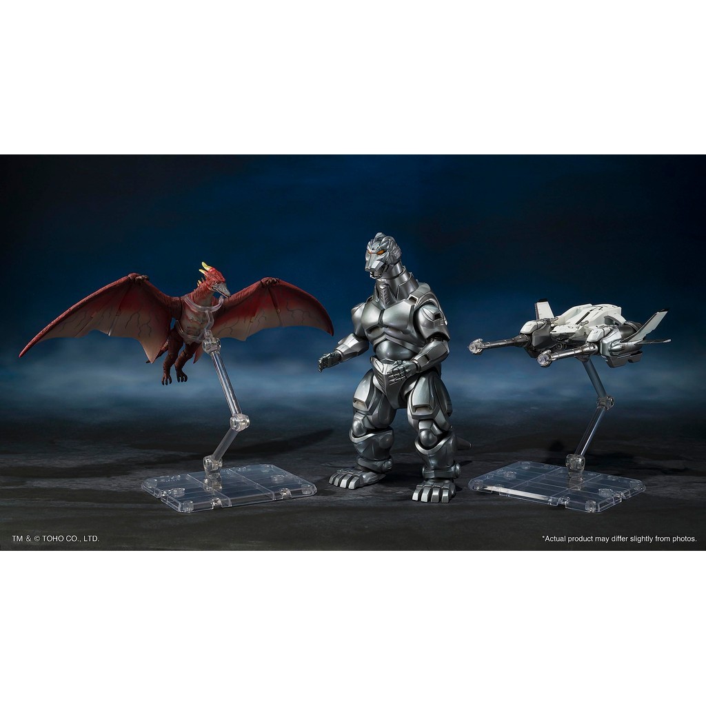 Mechagodzilla is based on the 2017 S.H.MonsterArts Super Mechagodzilla, with a partially reconfigured head and an optional damaged eye inserted to recreate the battle with Fire Rodan.